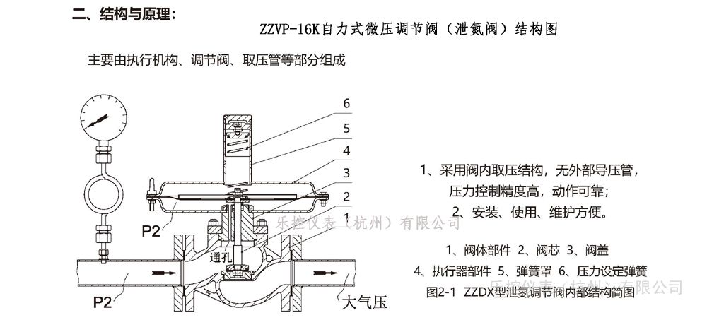 ZZYVP-16B新款氮封阀是一种无须外来能源,利用被调介质自身的压力变化达到自动调节和稳定阀后压力为设定值。该阀压力设定在指挥器上实现,方便、快捷,压力设定值在运行中也可随意调整;控制精度高,可比一般ZZY型直接操作自力式压力调节阀高,适合于控制精度要求高的场合。它广泛应用于氮封水箱系统氮气保护自动调节装置。三、工作原理图: